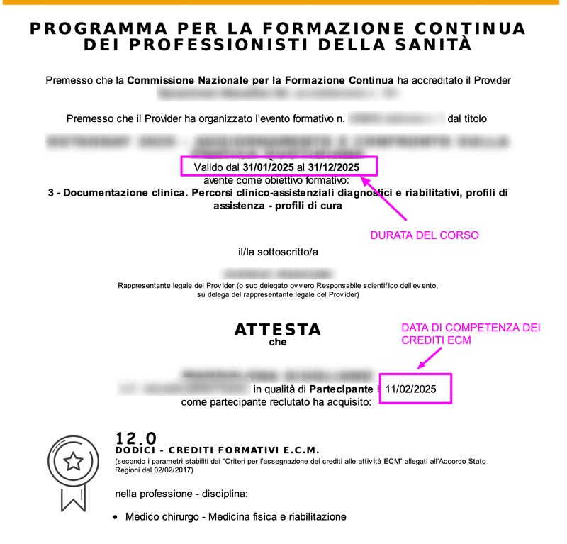 Esempio: se un utente ha conseguito i crediti in data 11/02/2025 per una Fad online dal 31/01/2025 al 31/12/2025, il suo nominativo verrà comunicato a Cogeaps a Marzo 2026. Cogeaps assegnerà nel corso del 2026 i crediti al partecipante con data di competenza 11/02/2025.